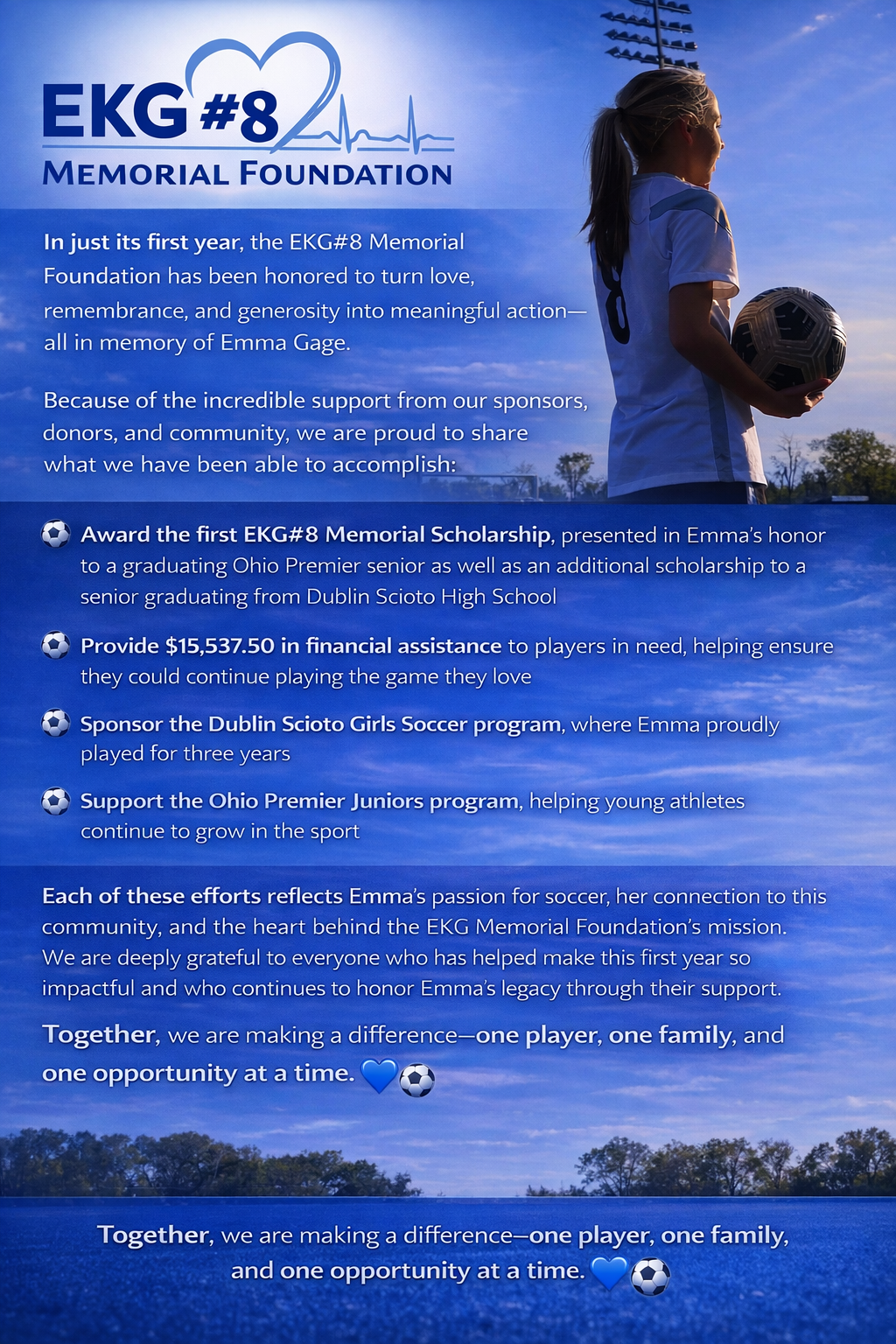 Emma was kind, inclusive, and always found the good in others. In her honor, the EKG #8 Memorial Foundation is awarding a $1,500 scholarship to one Ohio Premier high school senior and a $1000 schcolarship to one Dublin Scioto high school senior pursuing their next step—whether college or trade school. Continued soccer participation is not required.